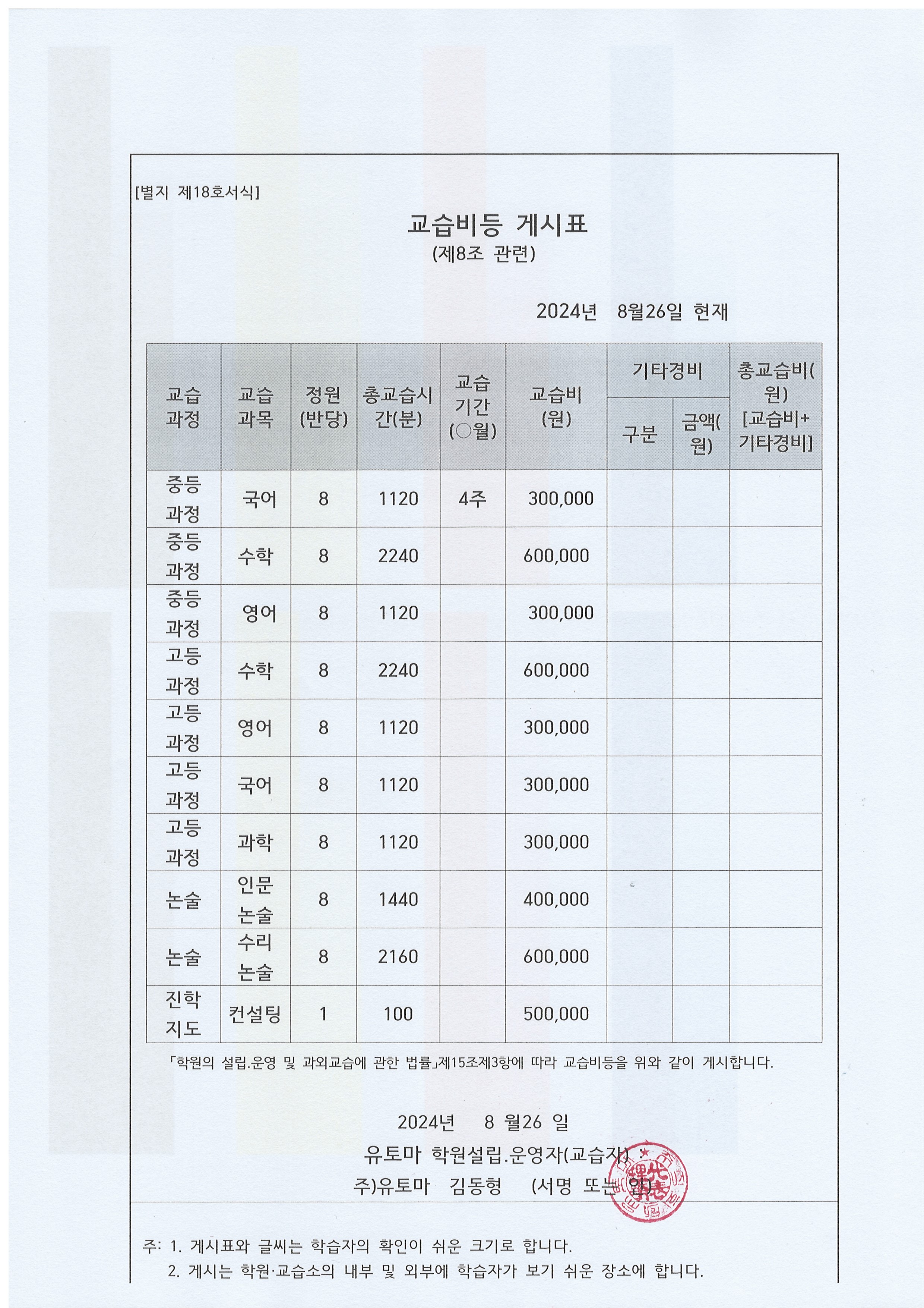 유토마학원(3층) 교습비 게시표 |