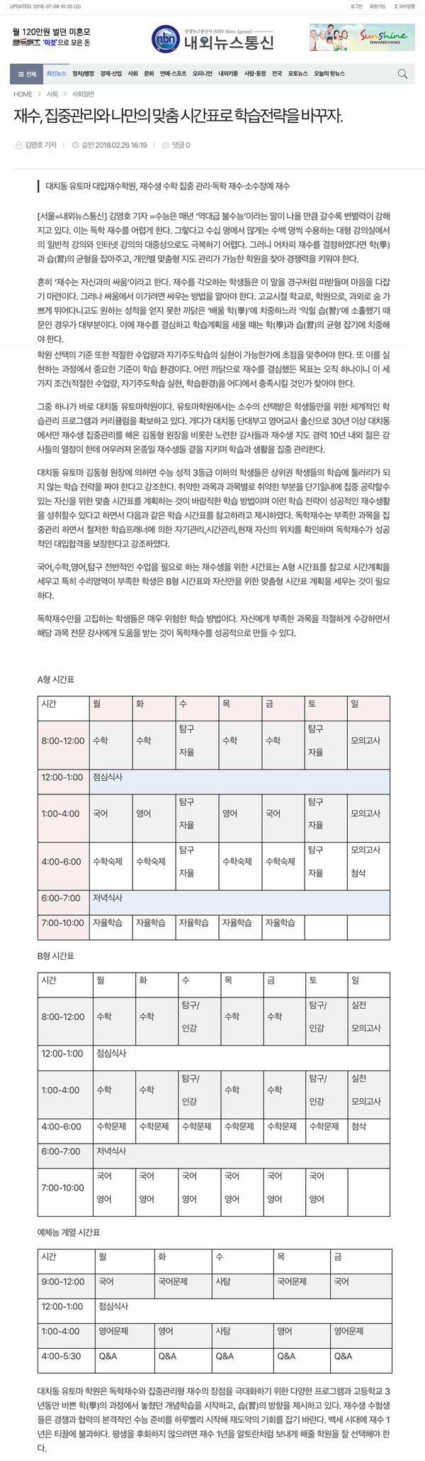 재수, 집중관리와 나만의 맞춤 시간표로 학습전략을 바꾸자 < 내외뉴스통신 >