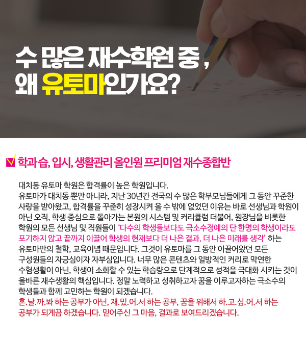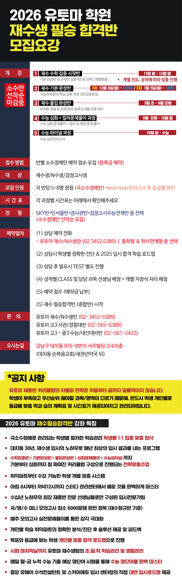 2027학년도 대치동 유토마 재수종합반 [필승 합격반] - 중위권/상위권 극소수정예 초밀착 맞춤관리 - 대치동 30년 노하우 유토마의 재수생 전문팀이 직접 관리하는 재수생 필승…