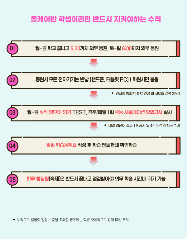 - 하교 후 5:30 의무 등원 후 이동없이 순공시간 확보!