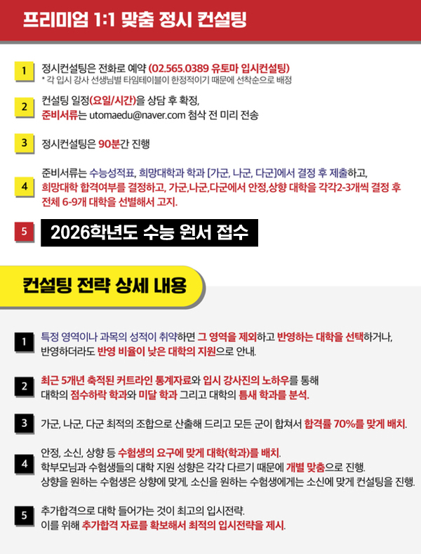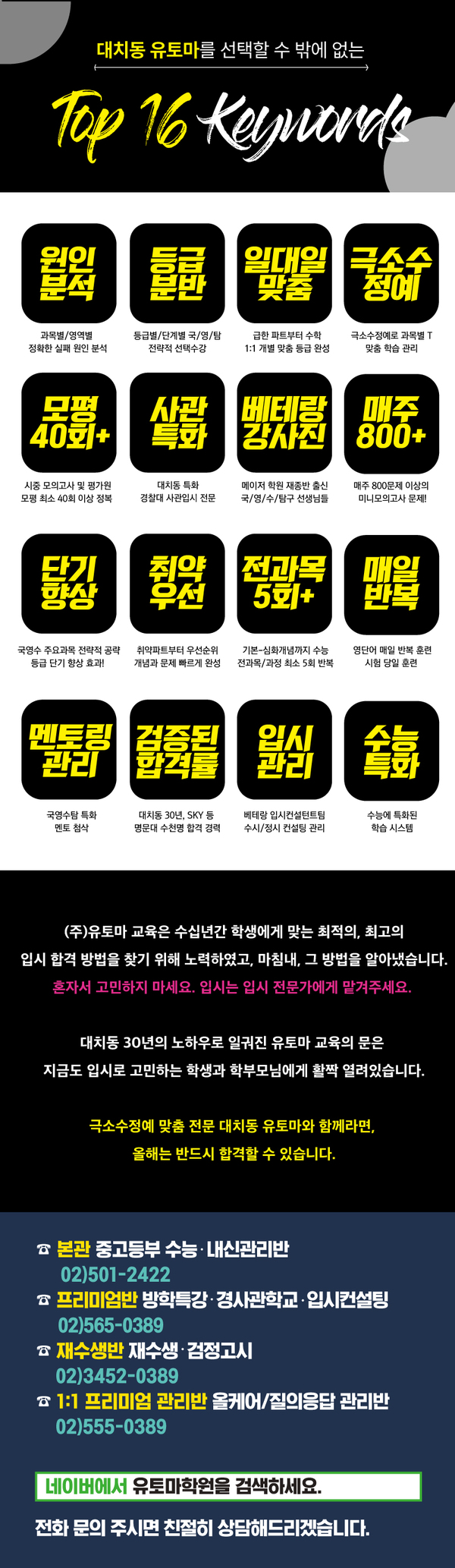 - 수 많은 대학 입학 실적 베테랑 대치동 입시컨설팅 강사진